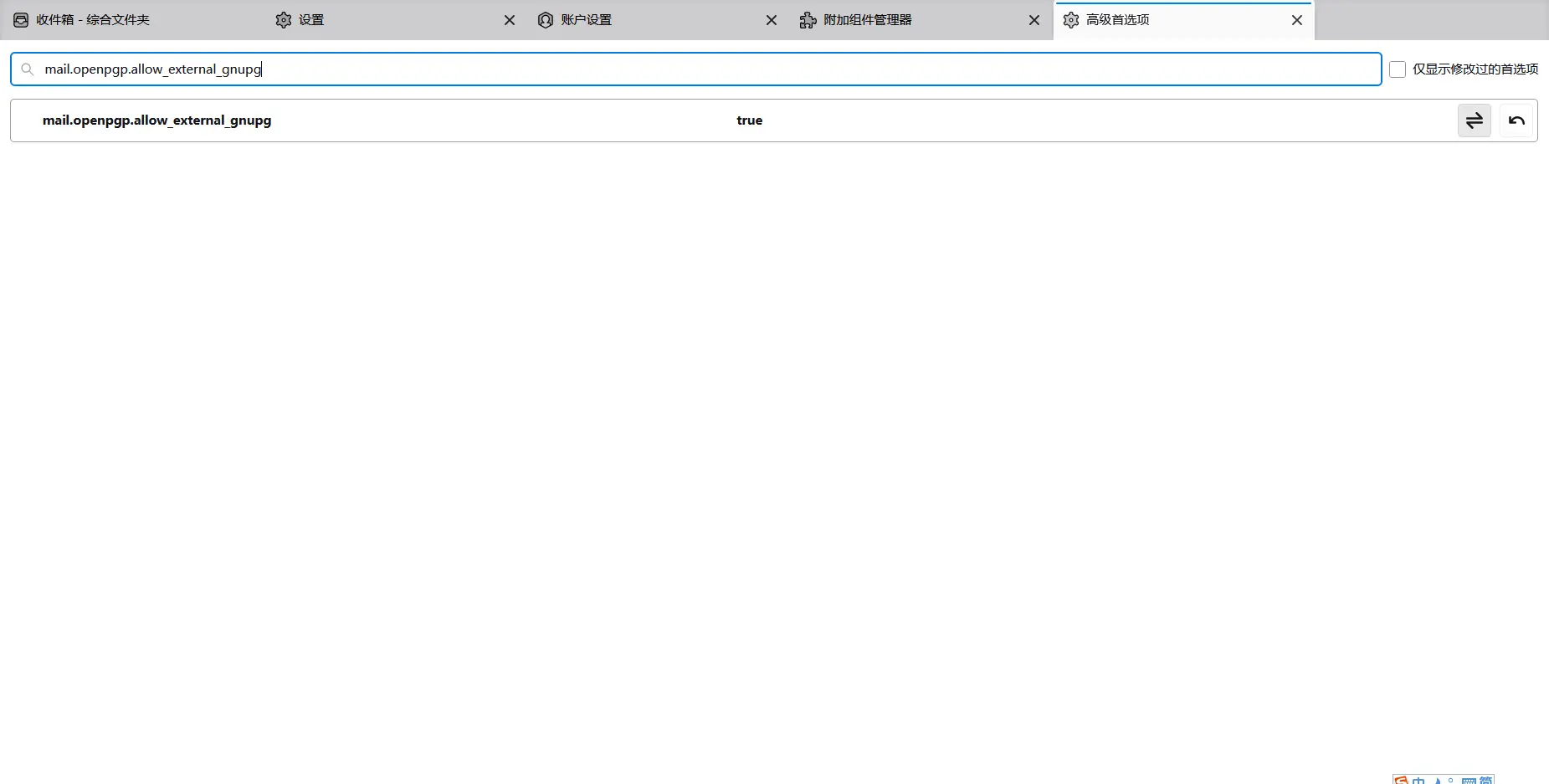 搜索 mail.openpgp.allow_external_gnupg 并将值切换到真。