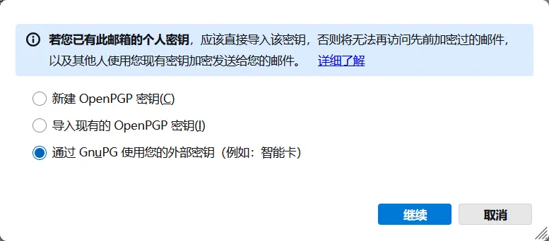 完成之后重启你的Thunderbird,然后进入账户设置 ,然后在侧边栏进入端到端加密 。选择“ 通过 GnuPG使用你的外部密钥(例如智能卡) ”选项,然后点击继续。